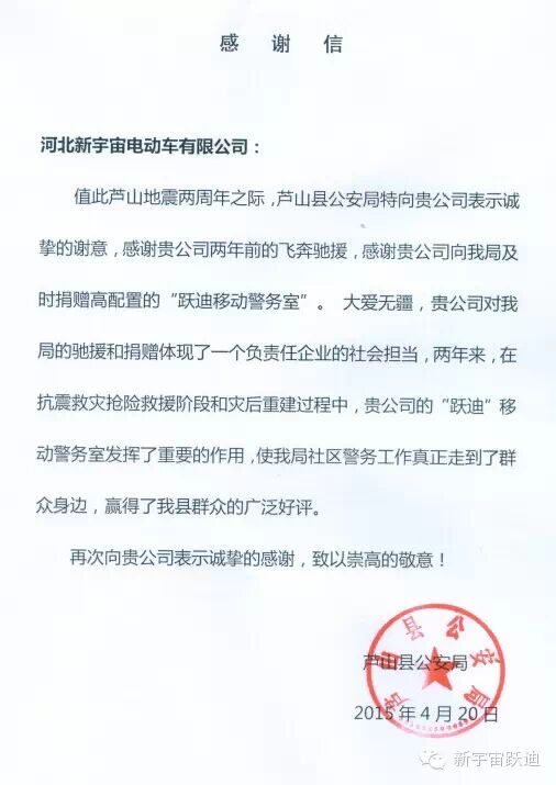 值此芦山地震两周年之际,芦山县公安局特向河北新宇宙电动车有限公司发来感谢信。