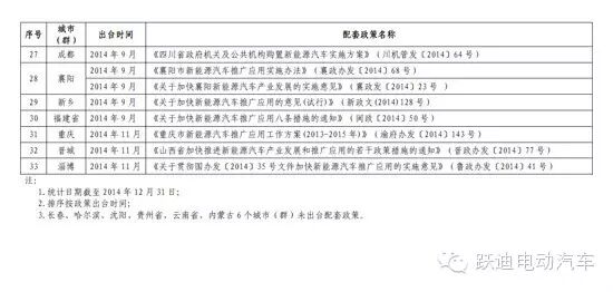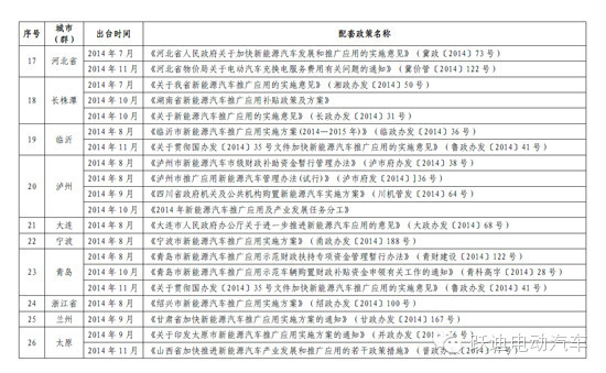 2月5日,国家装备司发布新能源汽车推广应用示范城市(群)配套政策出台进展情况显示:截至2014年底,列入新能源汽车推广应用城市(群)的39个城市(群)88个城市中,有33个城市(群)70个城市已出台新能源汽车推广应用配套政策措施。同时,仍有长春、哈尔滨、沈阳、贵州省、云南省、内蒙古 6 个城市(群)未出台配套政策。